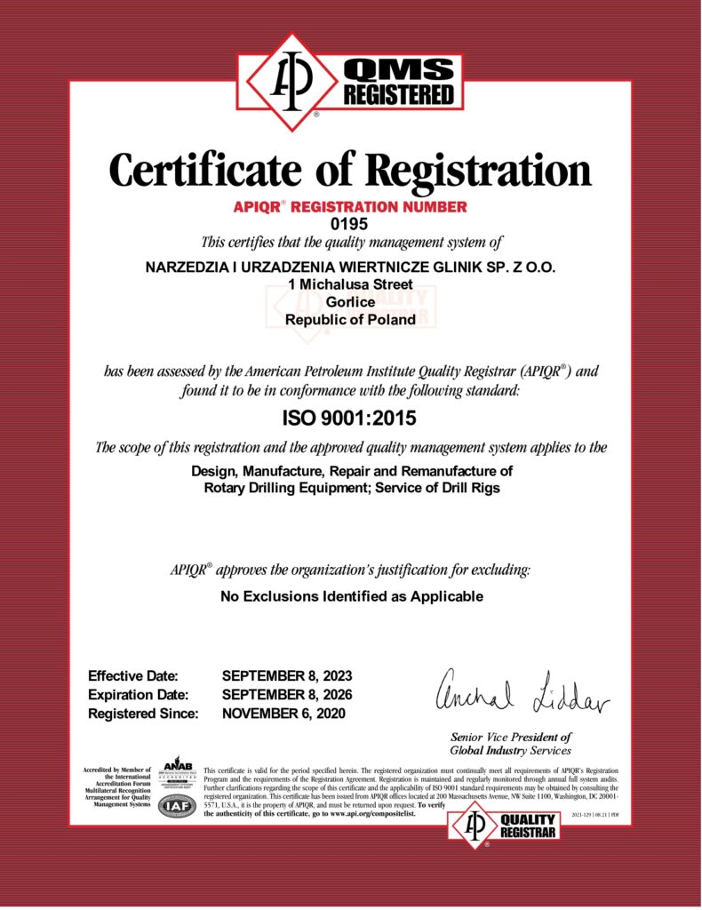 Posiadamy certyfikowany system zarządzania jakością na podstawie API Q1 i ISO9001. W zakresie projektowania, wytwarzania, naprawy i regeneracji narzędzi wiertniczych.